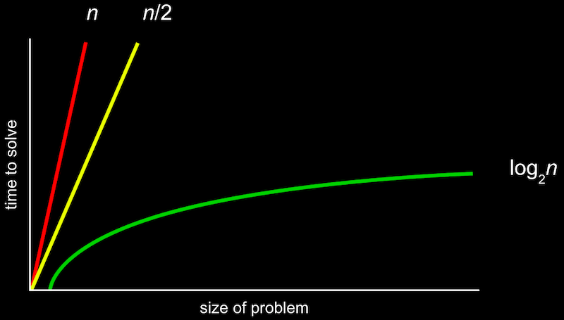 위 n 그래프와 n/2 그래프를 보자. 위 두 그래프를 Big-O 표기법으로 표현하면 O(n)이다. O(n)은 n만큼 커지는 것이므로 n이 늘어날 수록 선형적으로 증가한다. n이 계속해서 커지면 1/2은 큰 의미가 없어지므로 둘 다 O(n)이다. (극한으로 생각하면 좀 더 쉽게 이해할 것이다.)