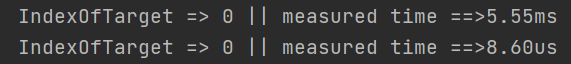 println("IndexOfTarget => ${measuredTime2.value} || measured time ==>${measuredTime2.duration}")