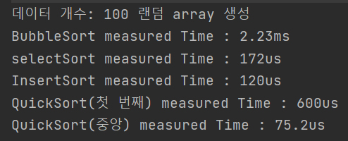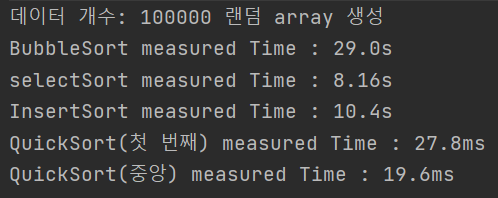흥미로운 점은 같은 퀵 정렬이라도 pivot 값의 기준에 따라 성능 차이가 발생했다. 대부분에 테스트에서 중앙 퀵정렬이 첫 번째 퀵정렬 보다 빠른 결과를 보여주었다.