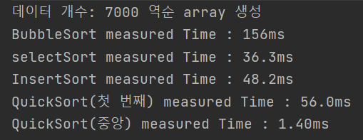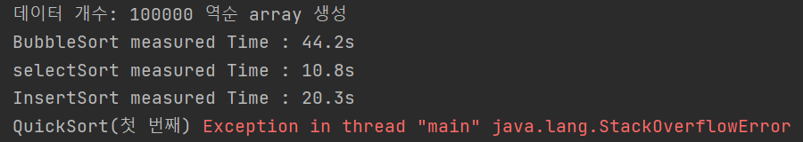 대략 데이터 개수가 7000 에서 8000 사이에서 첫 번째를 기준으로 한 퀵 정렬에서 stackoverflow 가 발생했다. 이는 reversed array 가 첫 번째 퀵 정렬의 최악의 상황이기 때문이다.