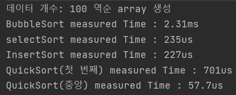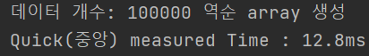 퀵 정렬의 성능 측정을 위해 두 가지의 array를 주었다. 첫 번째로는 random array와 두 번째로는 reversed array이다.