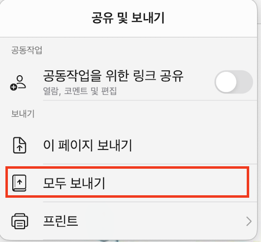추출을 원하시는 노트로 들어가서 상단에 공유하기 버튼을 클릭합니다. (아래 사진처럼 공유하기 버튼이 없으면 ··· 클릭하여 공유 버튼 클릭)