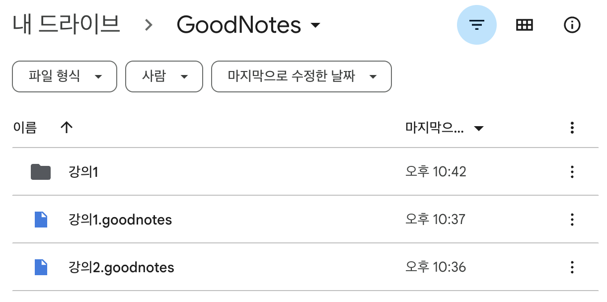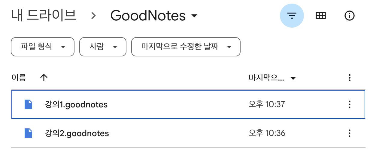 저는 "GoodNotes" 라는 폴더를 만들고, 그 안에 "강의1", "강의2" 파일을 업로드했습니다.