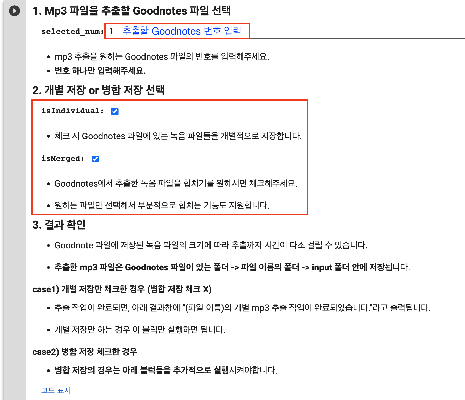 추가적으로 Goodnotes 파일에 저장된 녹음 파일들을 개별로 추출할지 아니면 합해서 추출할지 체크한 뒤 실행해주세요.
