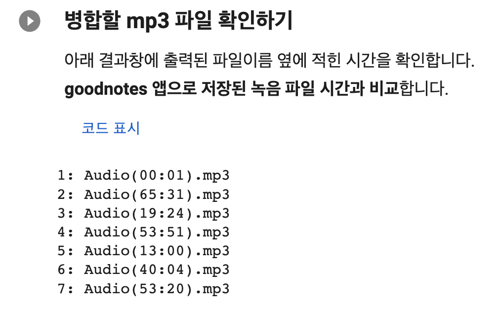 추가적으로 [병합할 mp3 파일 확인하기] 코드를 실행시켜주세요. 아래처럼 (번호): Audio(녹음시간).mp3 형식으로 출력이 됩니다.