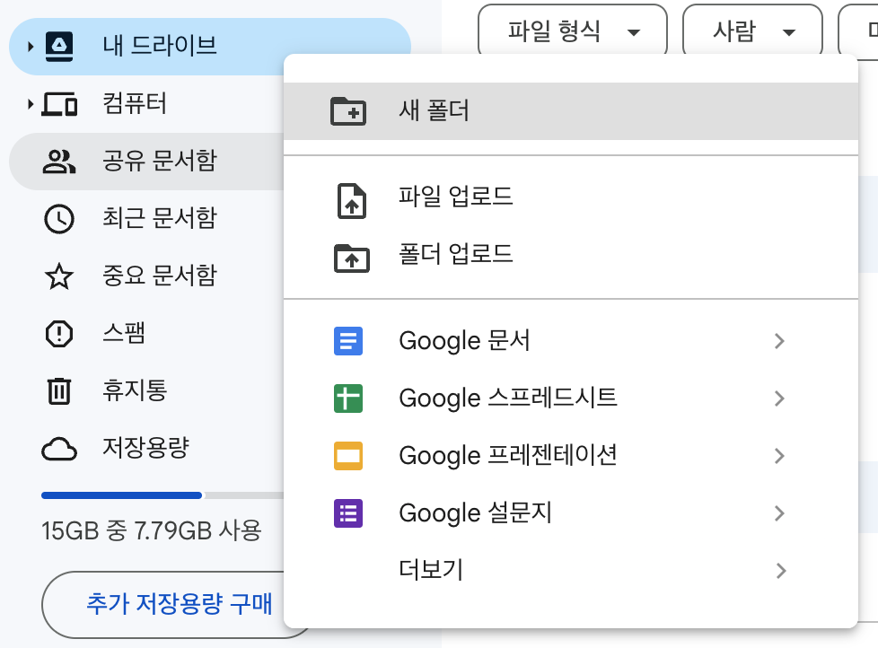 우선 자신의 구글 드라이브에 접속한 후, 내 드라이브를 우클릭해서 새 폴더를 만들어주세요. (새로운 폴더를 만들지 않고 기존의 폴더를 사용해도 됩니다.)