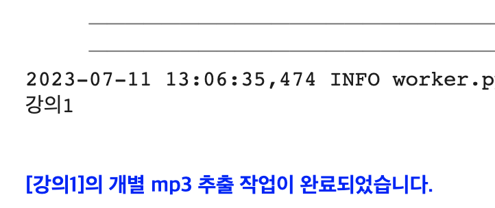 실행 후 기다리면, 아래 그림처럼 결과창에 "[파일이름]의 개별 mp3 추출 작업이 완료되었습니다." 라고 출력됩니다. (녹음 파일의 크기에 따라 시간이 많이 소요될 수 있습니다.)