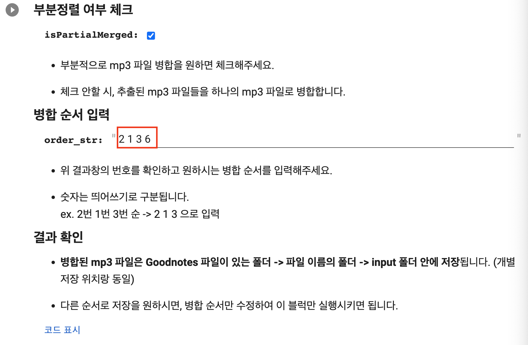 -> 전체가 아닌 부분적으로 mp3를 합치고 싶으시면 isPartialMerged를 체크해주세요.
