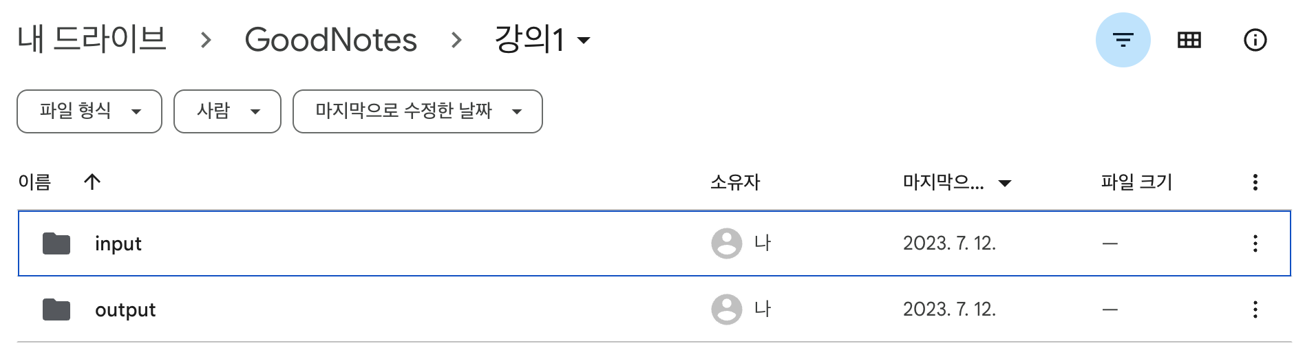 구글 드라이브로 접속하면 입력한 폴더 이름으로 폴더가 생성되고, 그 안에 input 폴더와 output 폴더가 생긴걸 확인할 수 있습니다.