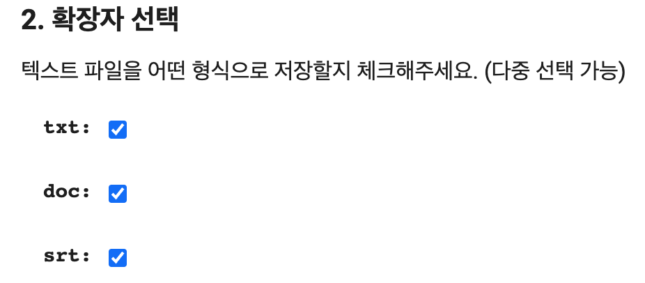 그 다음으로 텍스트 파일을 어떤 형식으로 저장할 것인지 선택해주세요. 텍스트(txt), 문서(doc), 자막(srt) 총 3가지 형식을 지원합니다.
