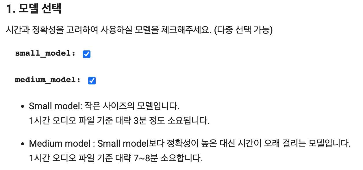 먼저, 텍스트 변환시 사용할 모델을 선택해주세요. 아래 모델 참고사항을 읽어보고 시간과 정확성을 고려하여 선택하면 됩니다.