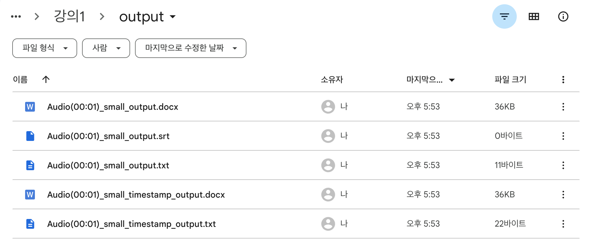 파일 이름은 (변환한 mp3 파일명)_(사용한 모델)_ouput.(파일 형식) 형태로 저장됩니다. 추가적으로 timestamp를 선택했으면 사용한 모델 뒤에 _timestamp가 붙어있습니다.