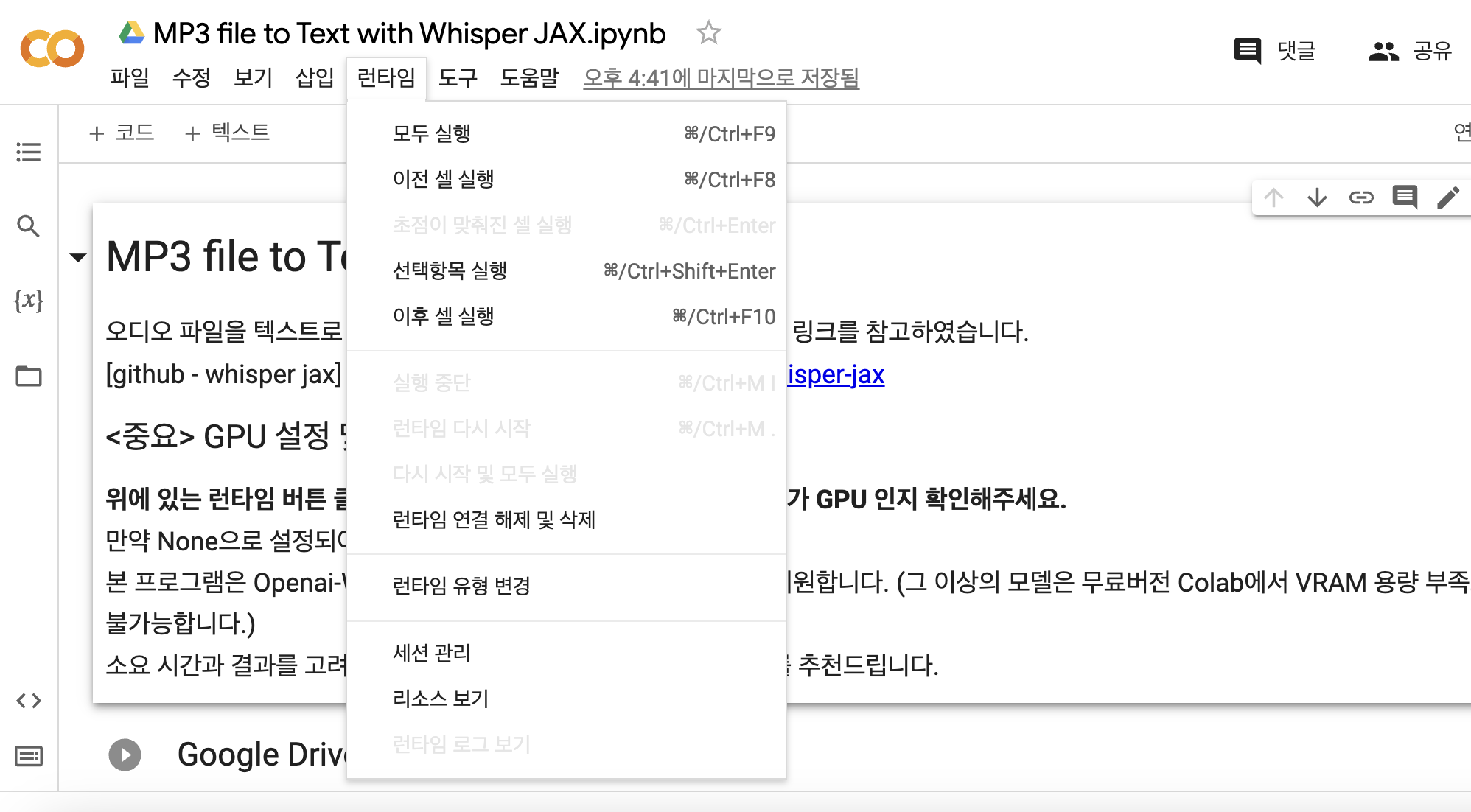 이번 게시글에서는 Colab으로 OpenAI Whisper with Jax를 이용하여 mp3 파일을 텍스트로 변환하고 자막을 생성하는 방법을 소개해드리려고 합니다.