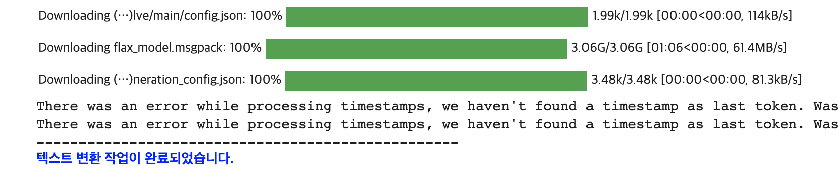옵션들을 다 선택했다면 이제 해당 블럭을 실행시켜주세요. 그럼 아래 사진처럼 "텍스트 변환 작업이 완료되었습니다."가 뜰 때까지 기다립니다. (파일의 크기, 선택 모델, colab 서버 네트워크 상황에 따라 시간이 오래걸릴 수 있습니다.)