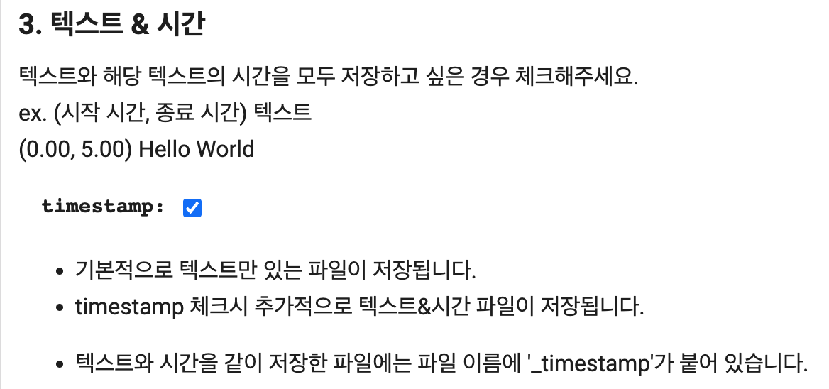 추가적으로 아래 사진처럼 시간과 텍스트 형식을 같이 저장하고 싶으면 timestamp 체크박스를 선택해주세요.
