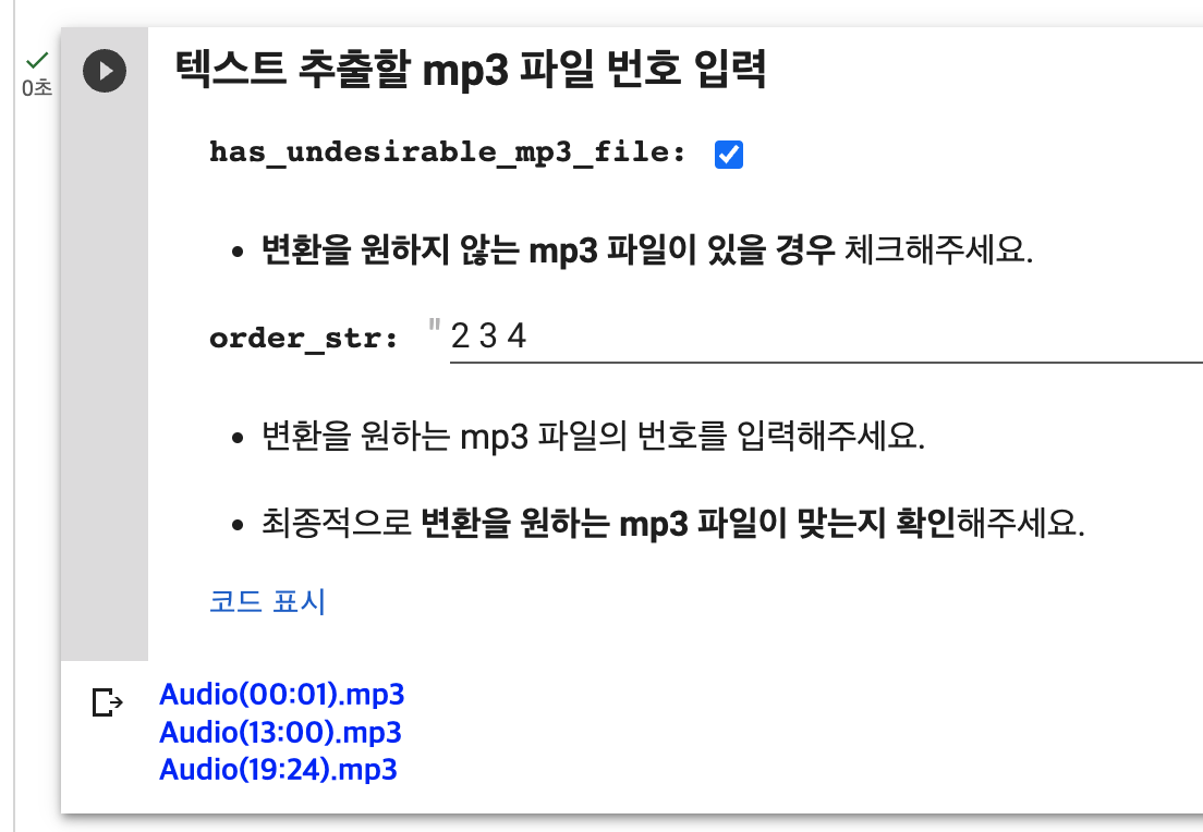그 후 아래 사진처럼 해당 블럭을 실행시킨 후 텍스트 변환하고 싶은 mp3 파일이 맞는지 확인해주세요. 결과에 이상이 없다면 [MP3 파일 텍스트 변환]으로 이동하면 됩니다.
