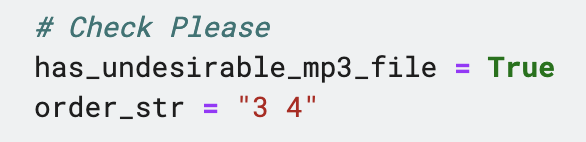 - order_str : has_undesirable_mp3_file 을 True로 설정한 경우에만 바꾸시면 됩니다. " " 안에 원하는 mp3 파일의 번호를 입력해주세요. (ex. "3 4") 띄어쓰기 주의해주세요! 3, 4 (X)