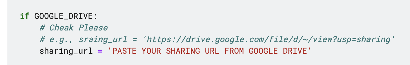복사한 링크를 아래 사진처럼 sharing_url의 ' ' 안에 붙여넣습니다. (ex. 'https://drive.google.com/file/d/~/view?usp=sharing')
