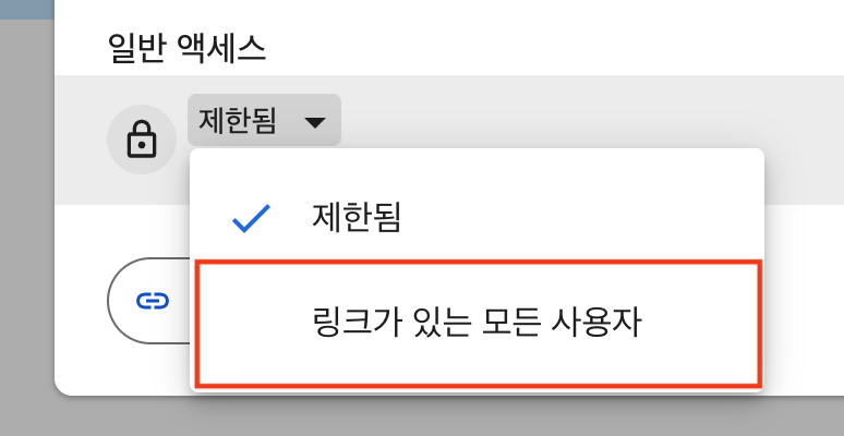 input.zip 혹은 하나의 mp3 파일인 경우는 해당 mp3 파일을 우클릭하고 공유 버튼을 클릭하면 창이 하나 뜹니다. 거기서 일반 액세스 부분을 제한됨에서 링크가 있는 모든 사용자를 선택합니다.