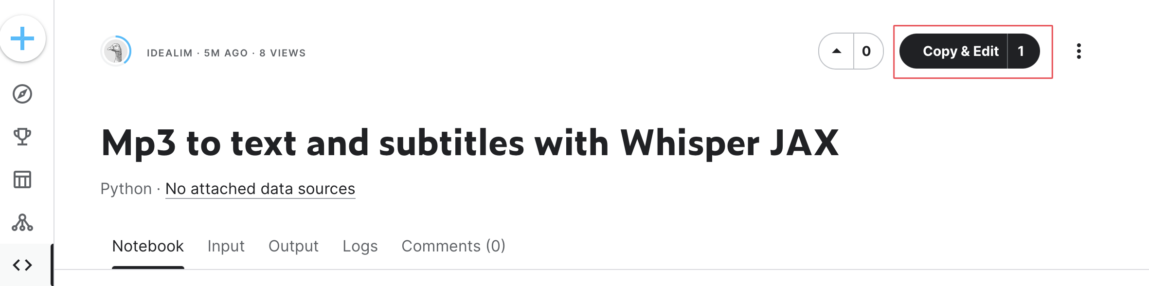 이제 본격적으로 Kaggle에서 MP3 파일을 텍스트 변환하는 방법에 대해 알아보겠습니다. Colab에서와 마찬가지로 MP3 파일을 텍스트 변환하는 방법은 크게 2개의 과정(파일 불러오기, 텍스트 변환하기)이 있습니다.