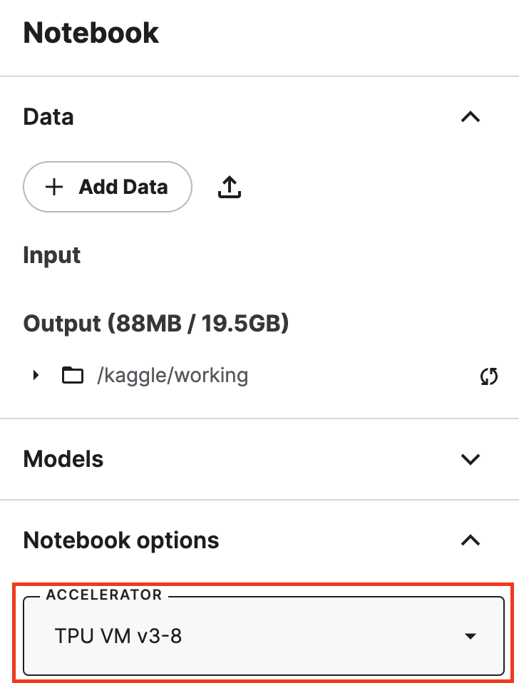 사이드바의 Notebook options에 있는 Accelerator를 TPU v3-8로 변경해주세요.