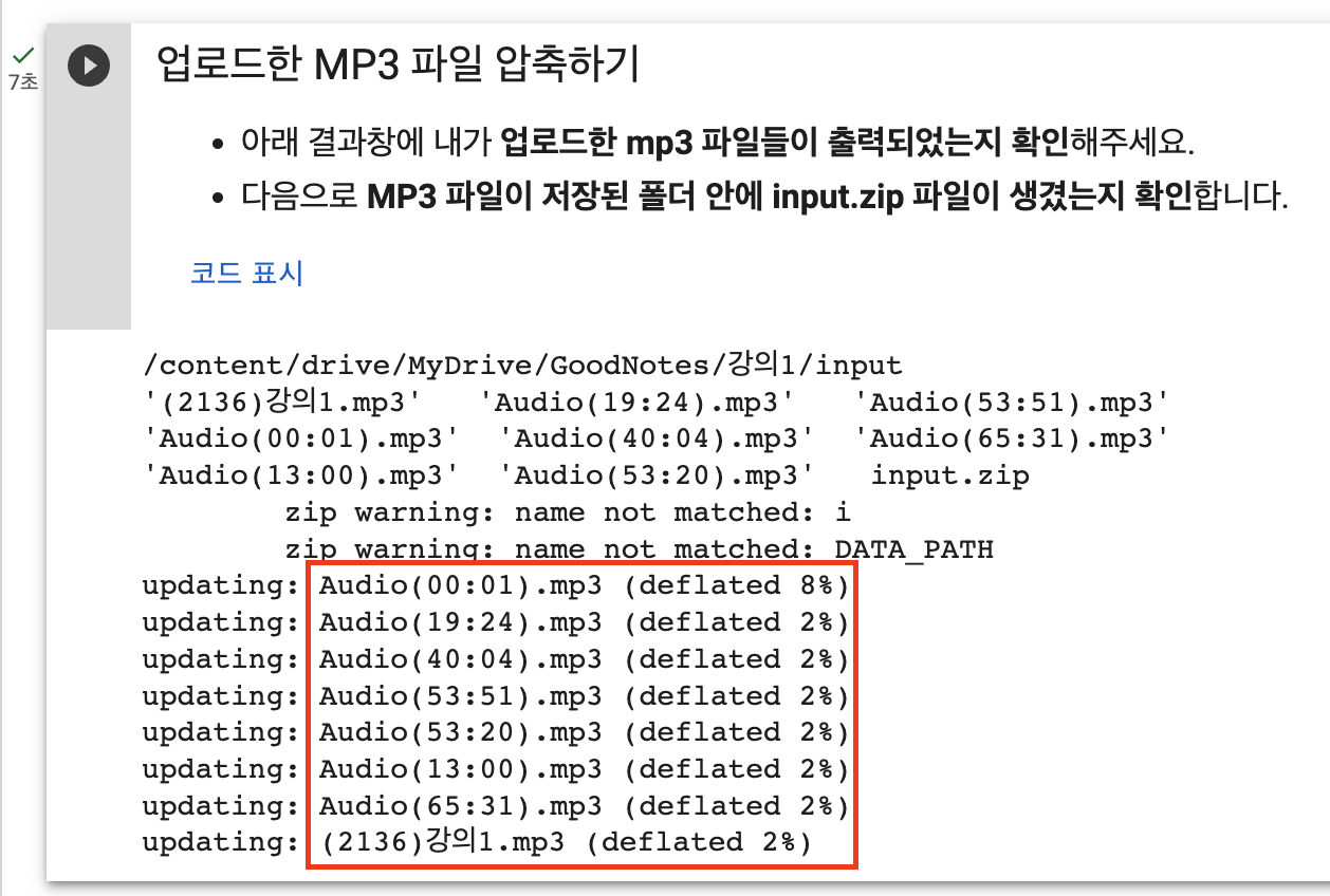 파일을 업로드를 하셨으면 다시 Colab으로 돌아가 [업로드한 MP3 파일 압축하기]를 실행시켜주세요. 아래 사진처럼 자신이 업로드한 파일이 모두 출력되었는지 확인해주세요.
