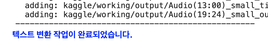 옵션을 다 선택하셨다면 해당 코드 블럭과 아래에 있는 코드 블럭들을 모두 실행시켜주세요. 결과창에 무언가(중간마다 초록색)를 계속 출력할텐데 당황하지마세요! 텍스트 변환에 필요한 라이브러리를 모두 다운받고 텍스트 변환하는데 시간이 다소 걸립니다. 변환하는 파일의 크기와 수, 선택한 모델에 따라 작업 시간이 오래걸릴 수 있습니다. 잠시 다른 일하면서 기다려주세요.😀