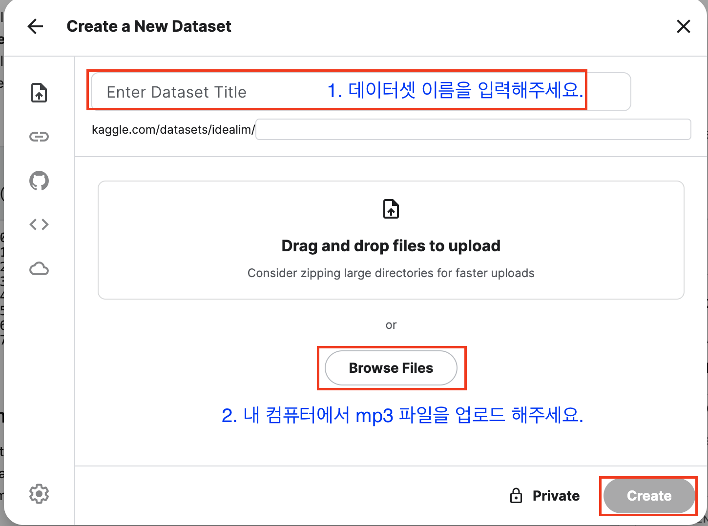 방법 1) Kaggle 에 직접 MP3 파일 업로드하기