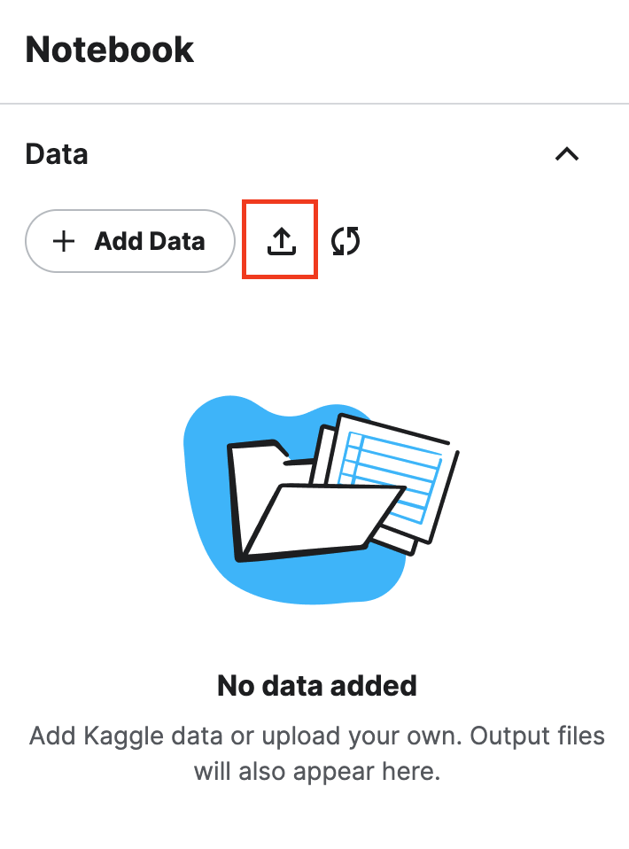 이 방법은 구글 드라이브처럼 Kaggle에서 제공하는 Kaggle Datasets이라는 곳에 파일을 저장합니다. 따라서 Kaggle Datasets에서 따로 파일을 삭제를 안했다면, 전에 입력했던 데이터셋 이름으로 해당 데이터셋에 이미 기존 파일이 있을 것 입니다. 이 경우 'Add Data'를 클릭하여 해당 데이터셋을 추가해주면 됩니다.