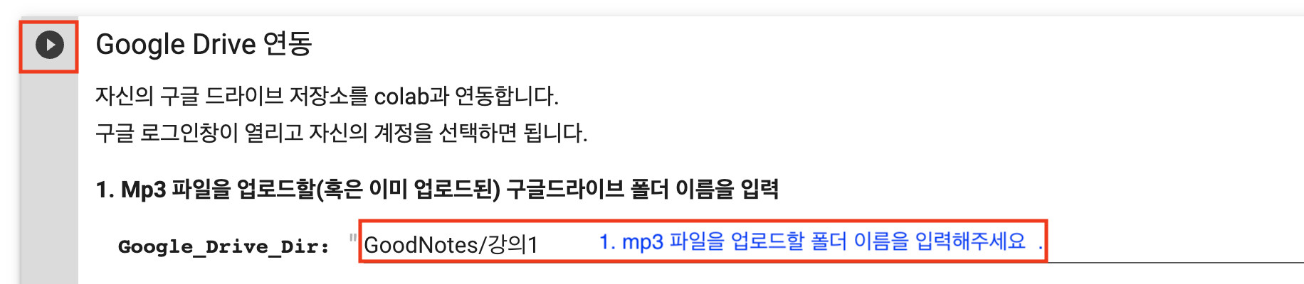 👉🏻 만약 mp3 파일의 크기가 크거나 수가 많을 경우, 이미 한번 Colab 버전으로 실행을 해서 이미 Google Drive에 파일이 업로드 되어있는 경우는 2번째 방법을 추천드립니다.