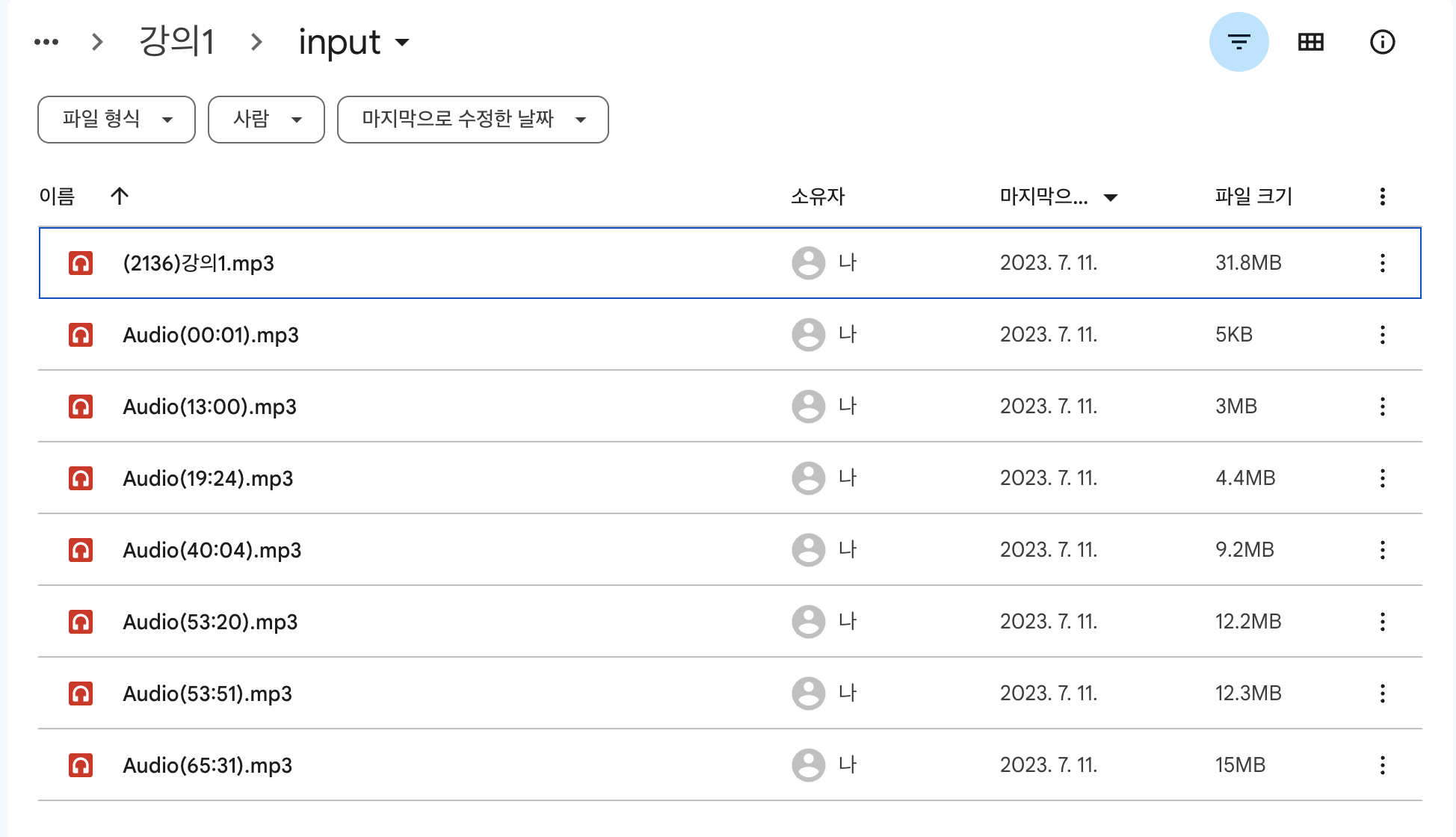 먼저, 파일 하나를 Kaggle에 불러오는 것은 매우 쉽습니다. 구글 드라이브에 mp3 파일을 업로드합니다. (이미 구글 드라이브에 업로드 되어있는 경우는 추가로 업로드 안하셔도 됩니다.) 그 후 아래로 내리셔서 [2. 업로드한 파일 공유하기]로 바로 넘어가주세요.