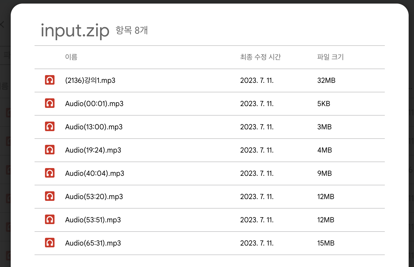 이제 mp3 파일이 있는 폴더로 가면 input.zip 이라는 파일이 새로 생겼을 것입니다. input.zip을 클릭하면 위 사진처럼 mp3 파일들이 잘 들어있는지 확인해주세요.