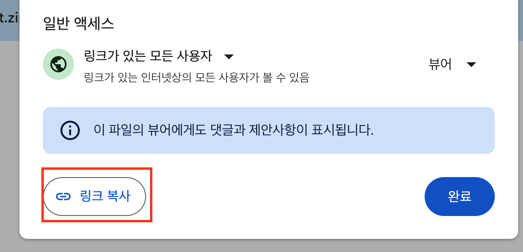 링크 복사를 클릭 후 완료 버튼을 누릅니다.