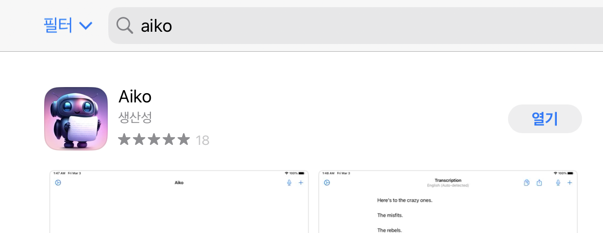 먼저, App store에 접속 후 `Aiko`를 검색합니다.