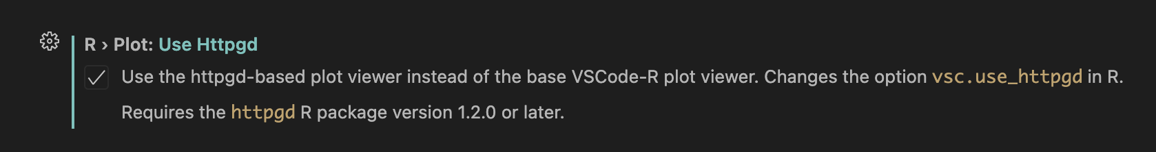 설치를 했다면 `command + , ` 를 입력하여 세팅 창을 띄운 후 httpgd 검색하고, 위 사진처럼 R>Plot: Use Httpgd 를 체크해줍니다. 이를 설정하면 Vscode 안에서 그래프 창을 보여줍니다.
