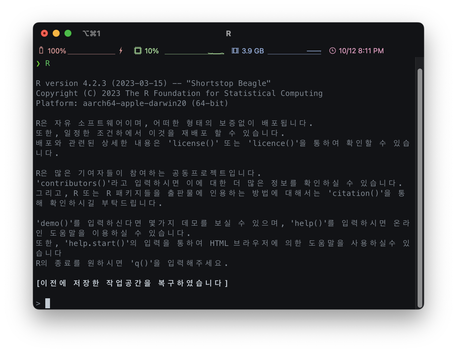 먼저 터미널을 킨 후, R을 입력하여 위와 같이 R Conlsole을 실행합니다. 그 후 아래 명령어를 입력하고 해당 패키지를 다운받습니다.