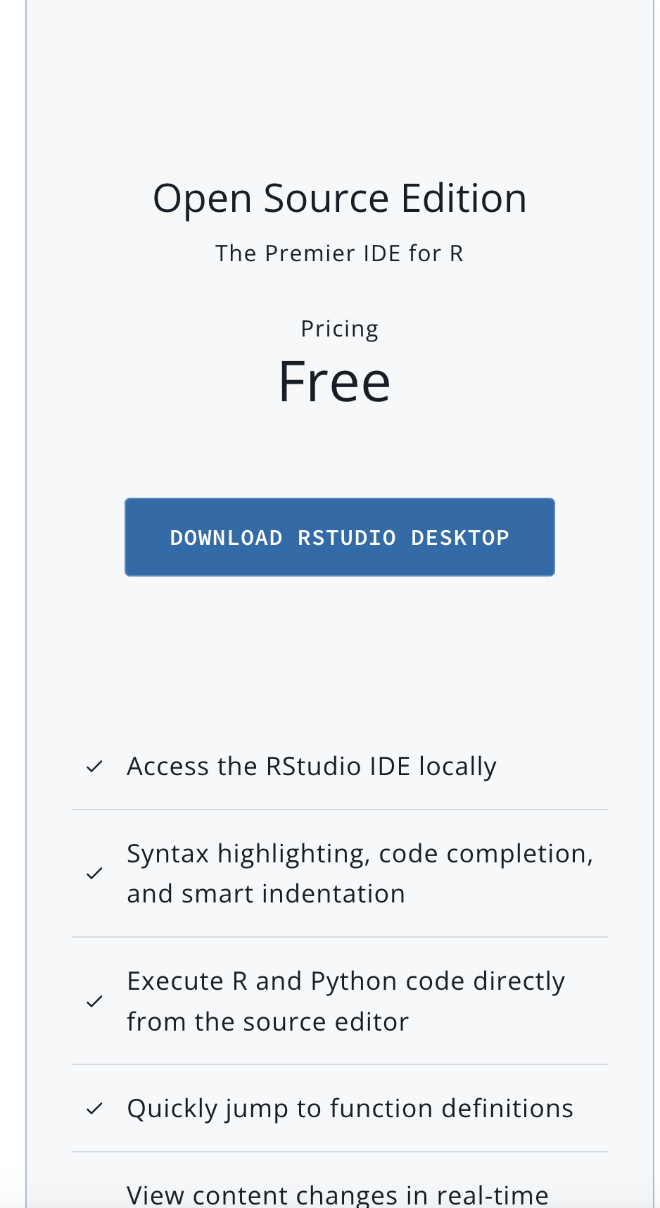 위 링크를 접속하면, 사진처럼 무료 오픈 소스 버전인 RStudio를 다운받을 수 있습니다.