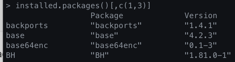 단, 패키지 이름과 버전만 확인하고 싶으면 `installed.packages()[, c(1,3)]`을 입력하면 됩니다.