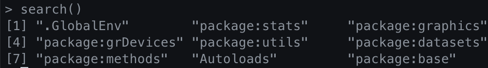 마지막으로 현재 실행중인 패키지들 정보를 확인하고 싶을 때는 `search()`를 입력하면 됩니다. 위 사진을 통해 기본적으로 R Console 실행시 불러오는 패키지들을 확인할 수 있습니다.