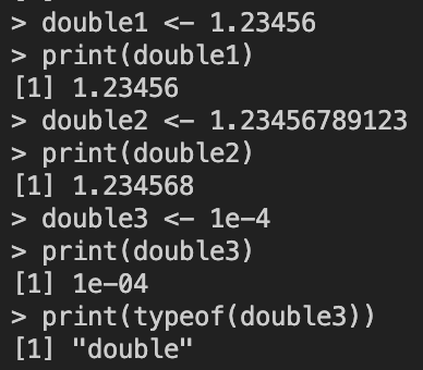 위 결과에서도 재미있는 사실 하나를 알 수 있습니다. `double2`의 출력결과를 확인하면, R console 창에서 소수를 출력할 때 특정 소수점 이하로는 잘리는 것을 확인할 수 있습니다.