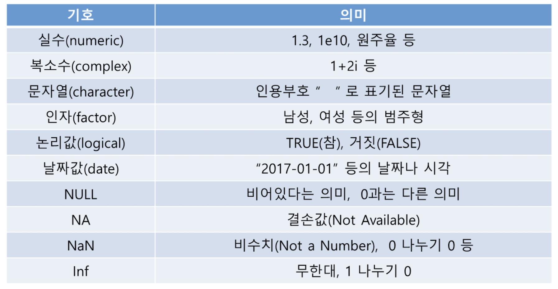 - `NA`: Not Available로 사용할 수 없는 데이터를 뜻하며, 일반적으로 결측값을 의미합니다.