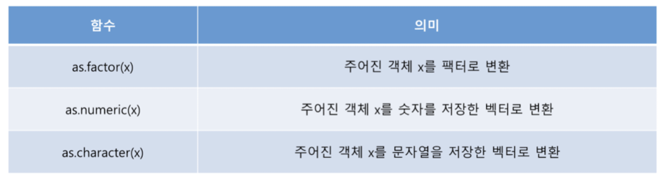 `as.{변환할 유형}`을 통해 데이터 타입을 변경할 수 있습니다. 예시는 다음과 같습니다.