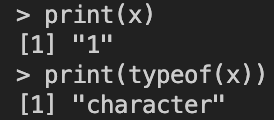 정수형 변수 x가 1 에서 ""로 감싸인 문자열 "1"로 변환된 것을 확인할 수 있습니다. 추가로 x에 벡터를 넣어도 벡터내 원소들이 모두 변환됩니다.