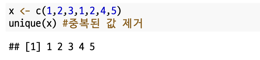 `unique()`를 이용하여 벡터에서 반복되는 값을 제거할 수 있습니다.