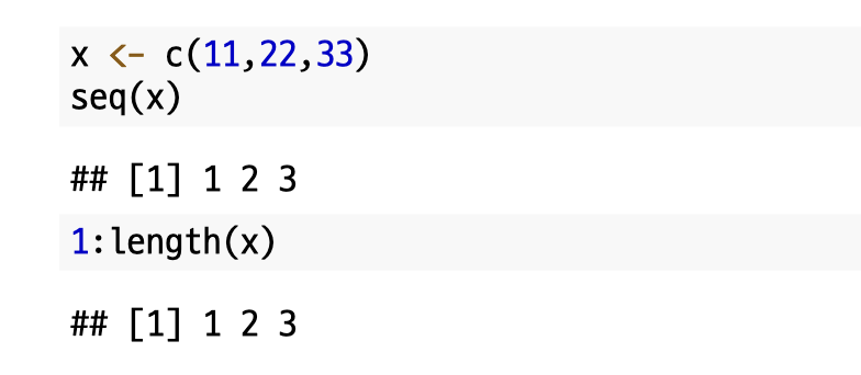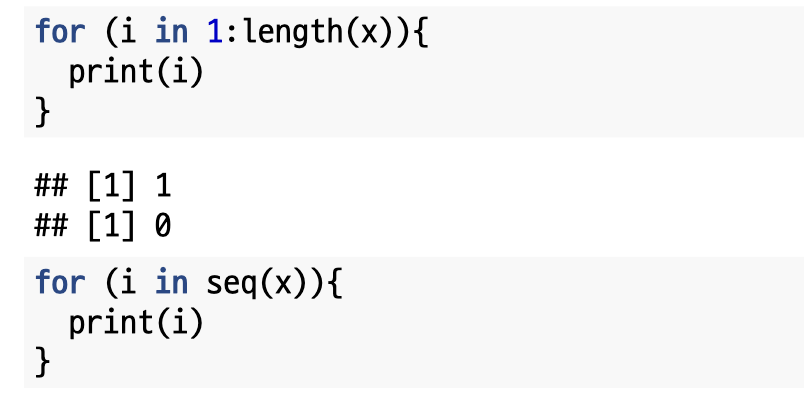 주로 1:length(x)을 for문에 사용하는 경우가 많은데요. 대신 seq(x)를 이용하여 x가 빈 경우일 때 대응할 수 있습니다.