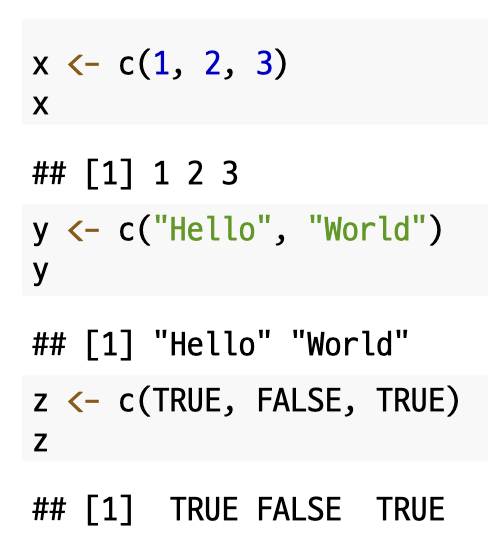 벡터는 `c()` 를 통해 생성할 수 있습니다. 참고로 c 는 combine의 약자입니다. 앞에서 배운 기본 데이터 타입의 변수들을 잘 출력하는 것을 확인할 수 있네요.