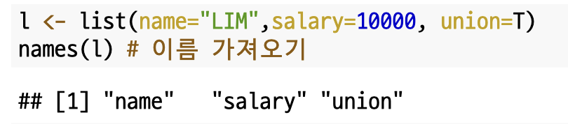 `names()` 을 이용하면 리스트의 이름을 가져올 수 있습니다.
