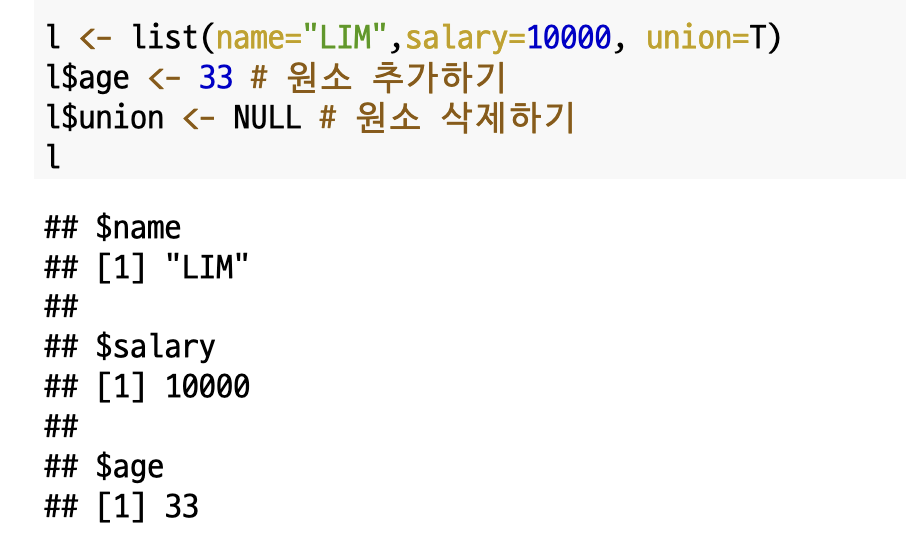 리스트에서는 재할당할 필요없이 원소를 추가할 수 있는데요. 위 코드 결과를 확인하면 age가 추가되고 union이 삭제된 것을 확인할 수 있습니다. 참고로 데이터를 삭제하기 위해서는 NULL를 변수에 넣어주면 됩니다.
