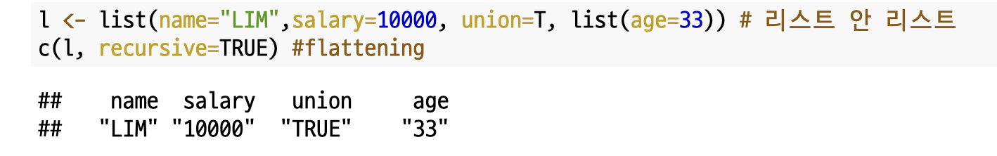 다른 방법으로는 `c()`를 이용하면 됩니다. 단, recursive=TRUE로 설정해야합니다.