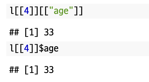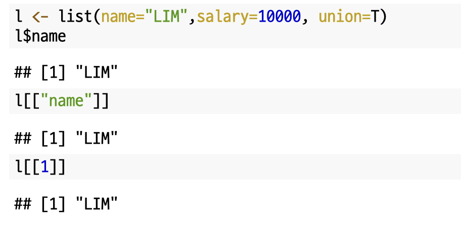 리스트의 원소에 접근하기 위해서는 `$`, `[[]]`을 이용할 수 있습니다.